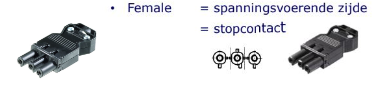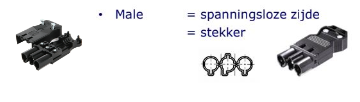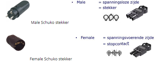 daardoor op contactpennen en daardoor op een male (Schuko) stekker. Het metalen deel bepaald de gender,
