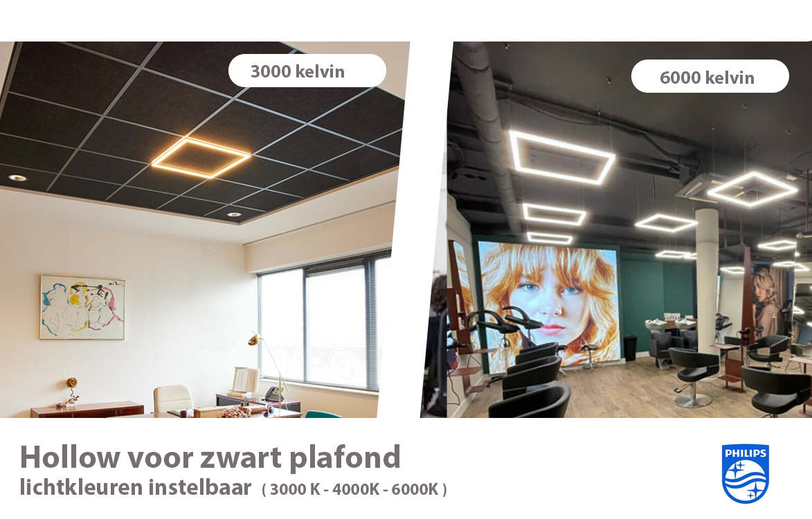 Warm of koel licht naar keuze en een zwarte rand die past bij donkere plafonds of designinterieurs. -